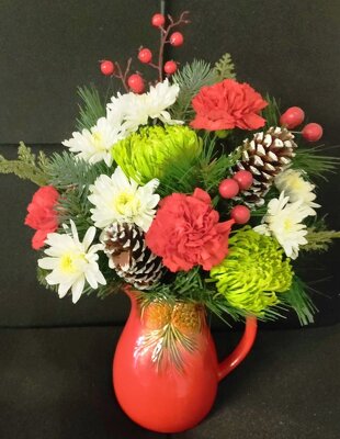A lovely Red Pitcher filled with seasonal greens and a mixture of fresh red, white and green flowers.