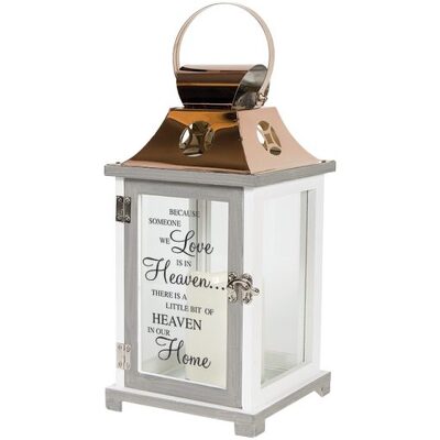 White wooden with metal top lantern. Front glass reads "Because someone we love is in Heaven, there is a little bit of Heaven in our home."