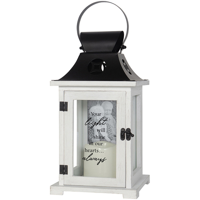 This lantern is made from quality composite wood and a metal black finish top. They feature a built-in automatic timer which runs for 6 hours on and 18 hours off. Front panel reads "Your light will shine in our hearts always" APX 13"H by 6.25"W